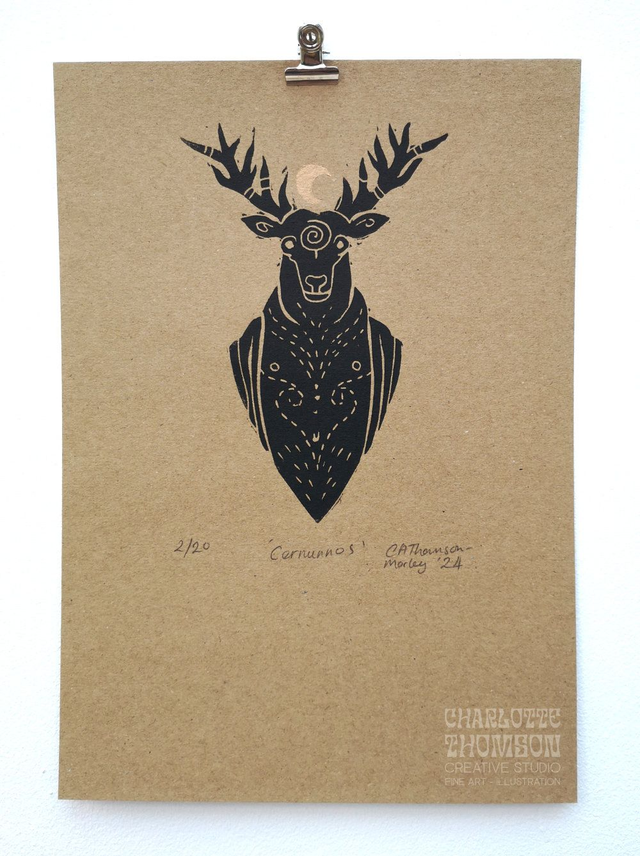 'Cernunnos' the Celtic deer headed god is a hand-printed Lino print in black and gold on eco-friendly recycled paper stock.