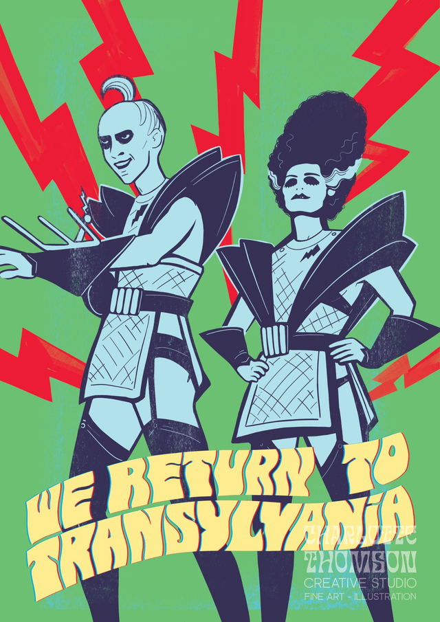 Riff Raff and Magenta from the Rocky Horror Picture Show, illustrated by me in their SciFi costumes from the final scenes of the film.